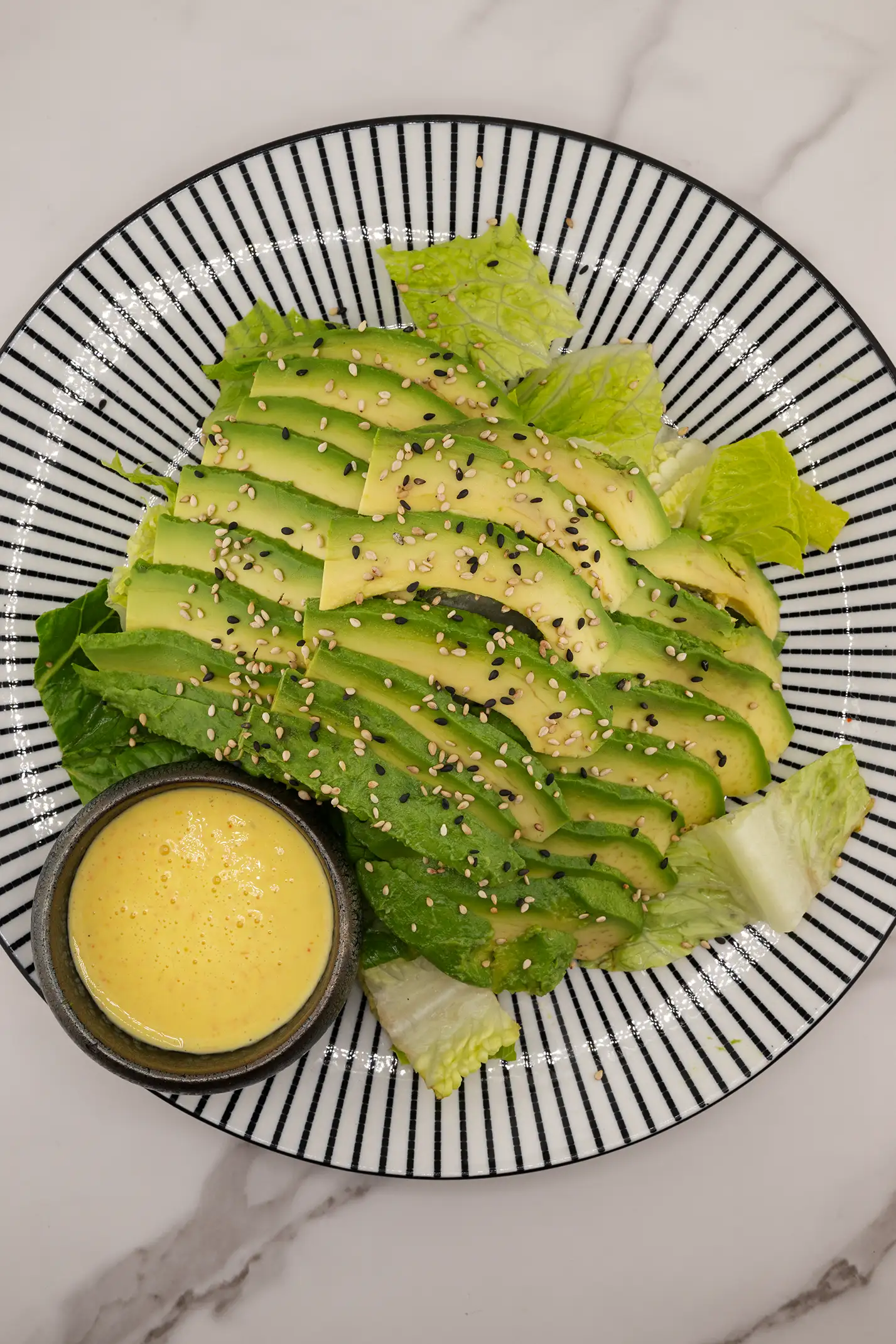 Creamy avocado served on a bed of mixed greens with a light vinaigrette.