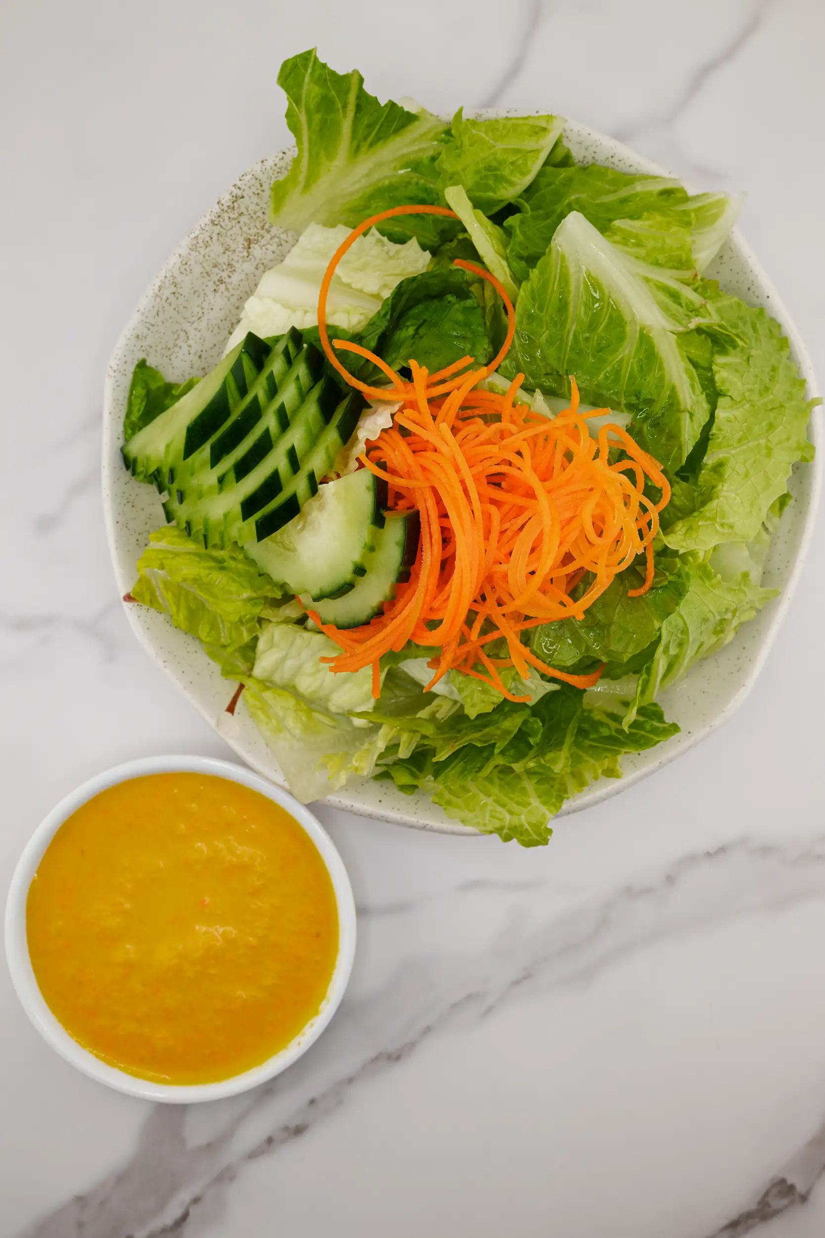 Fresh mixed greens, cucumbers, and tomatoes served with your choice of dressing.