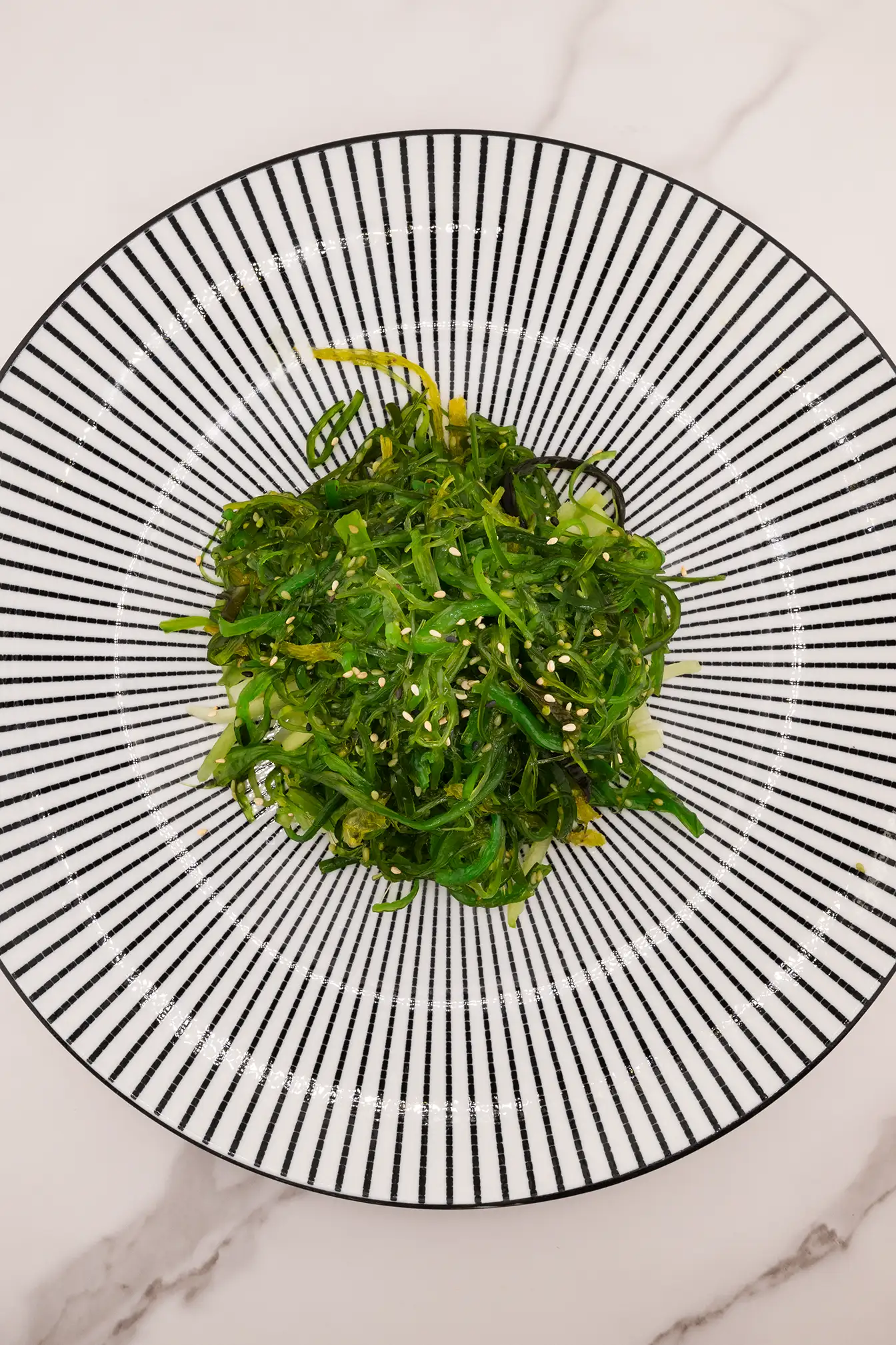 A refreshing salad made with marinated seaweed, sesame seeds, and a tangy dressing.