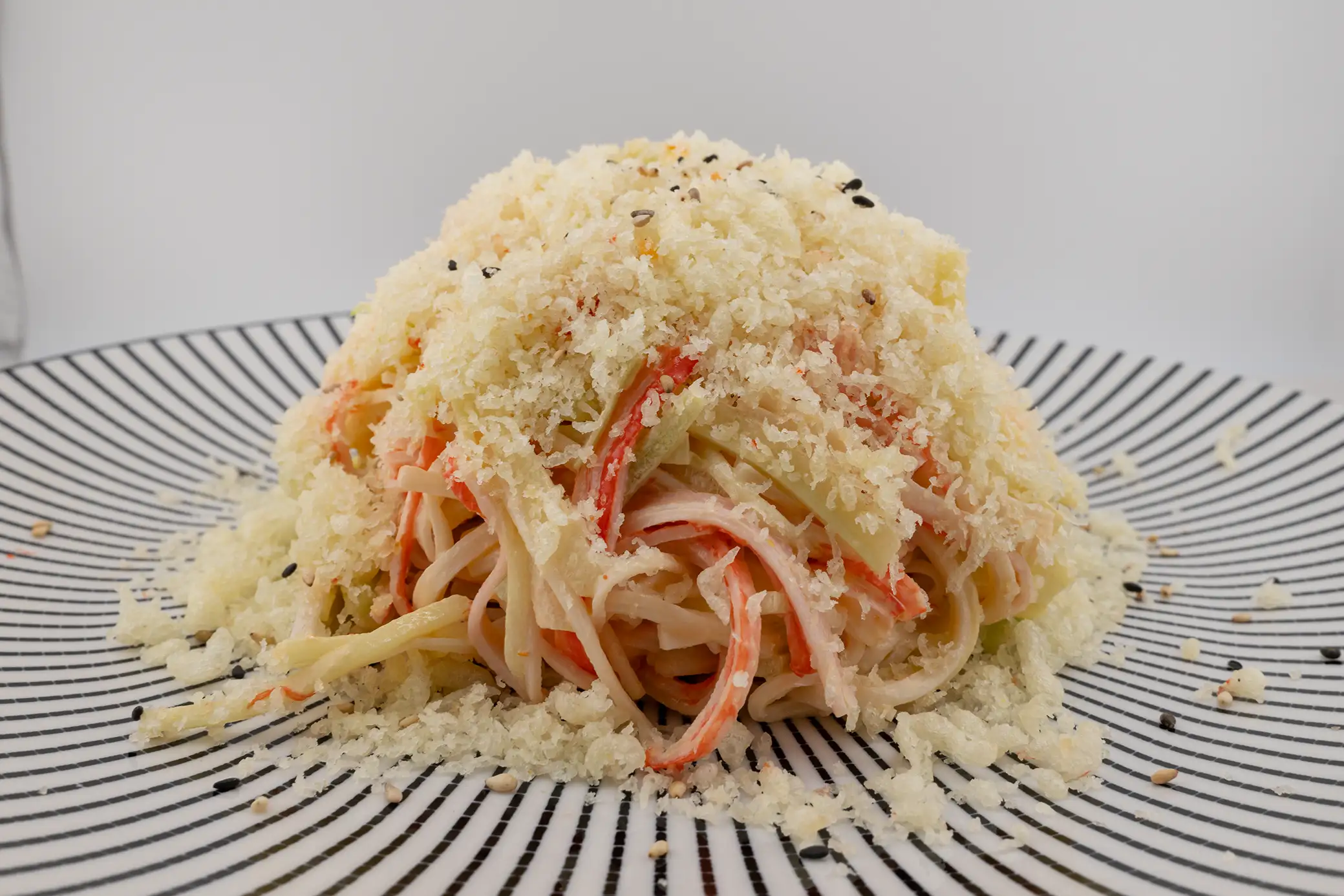 A spicy salad made with kani, avocado, and mixed greens, topped with a zesty dressing.