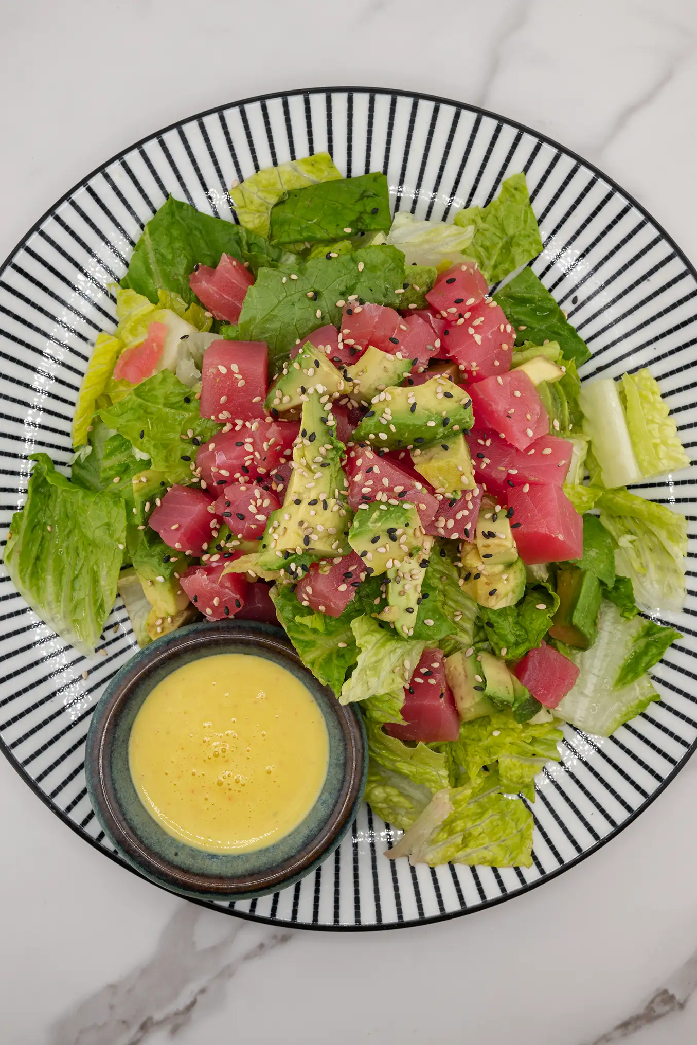 Fresh tuna and avocado served on a bed of mixed greens with a citrusy ponzu dressing.