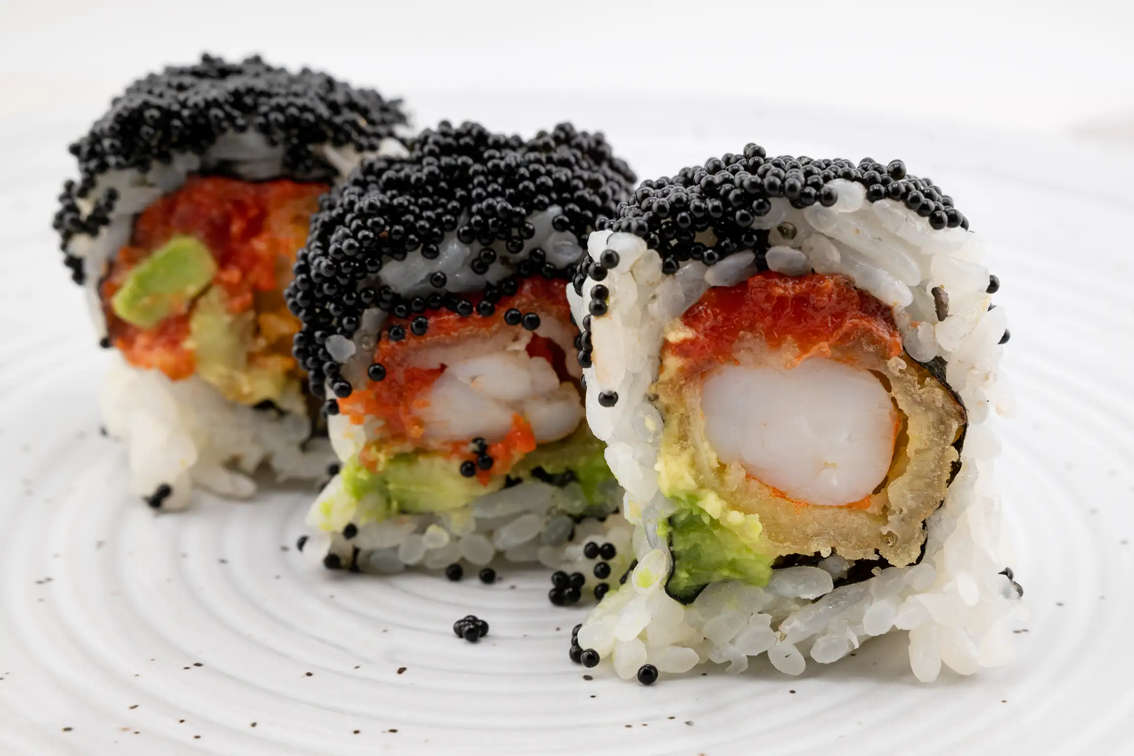 Spicy tuna, avocado, shrimp tempura inside topped with black caviar.