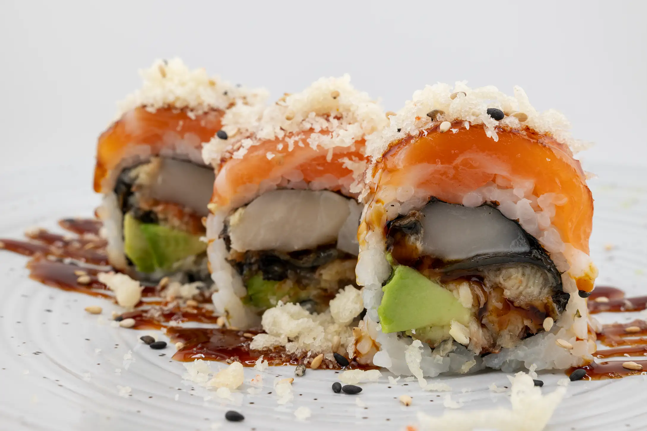 Oven baked eel, white tuna, avocado topped with a layer of salmon and tempura crunch.
