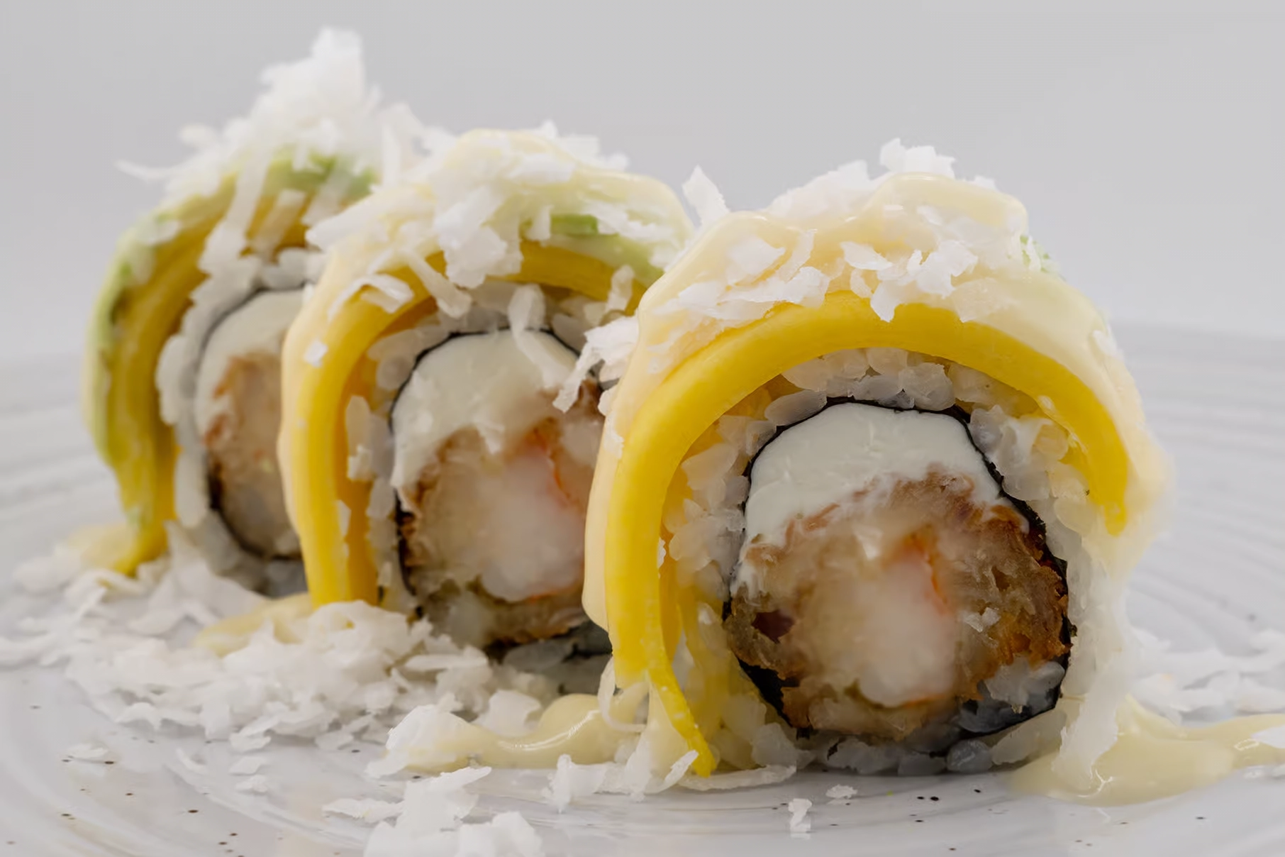 Tempura coconut shrimp with cream cheese topped with a layer of fresh mango and avocado, drizzled with chef's special mango sauce and coconut flakes.