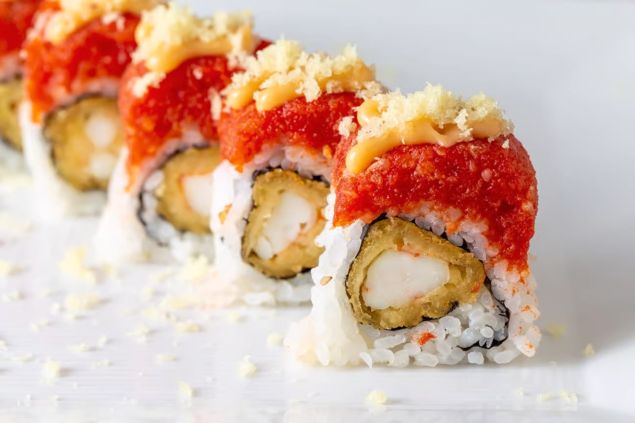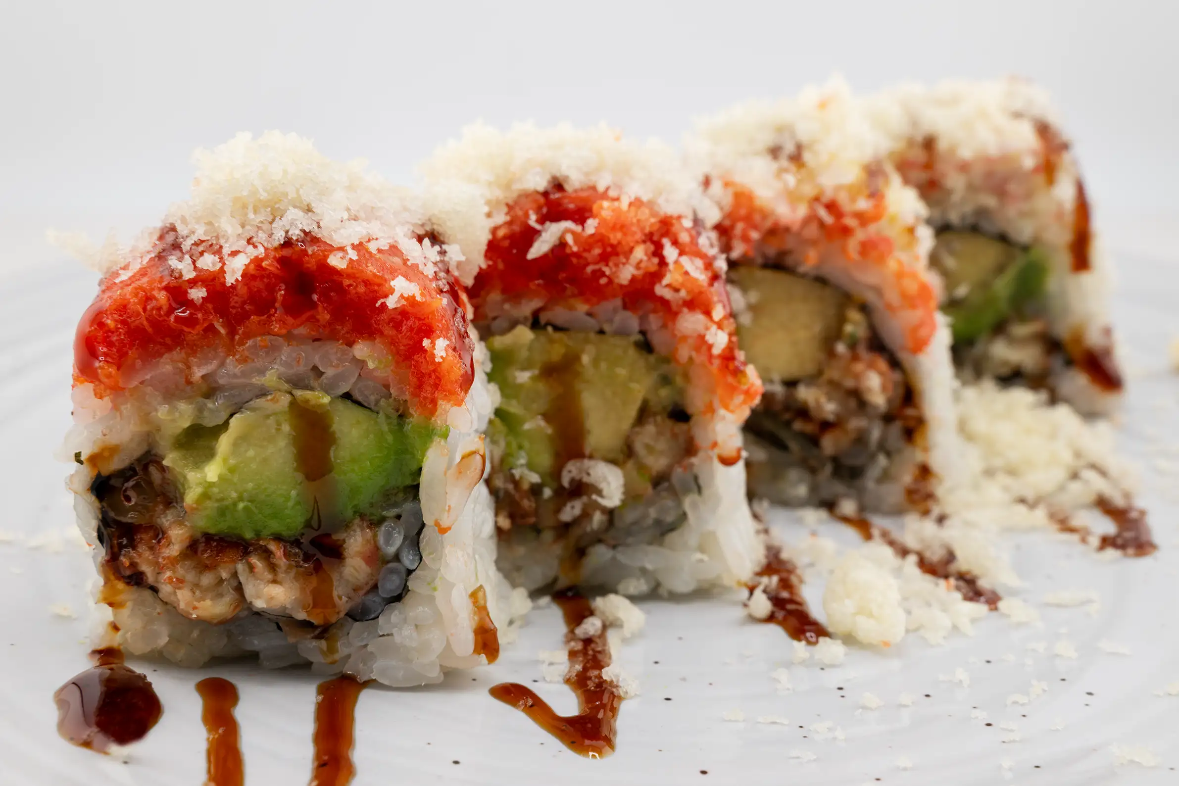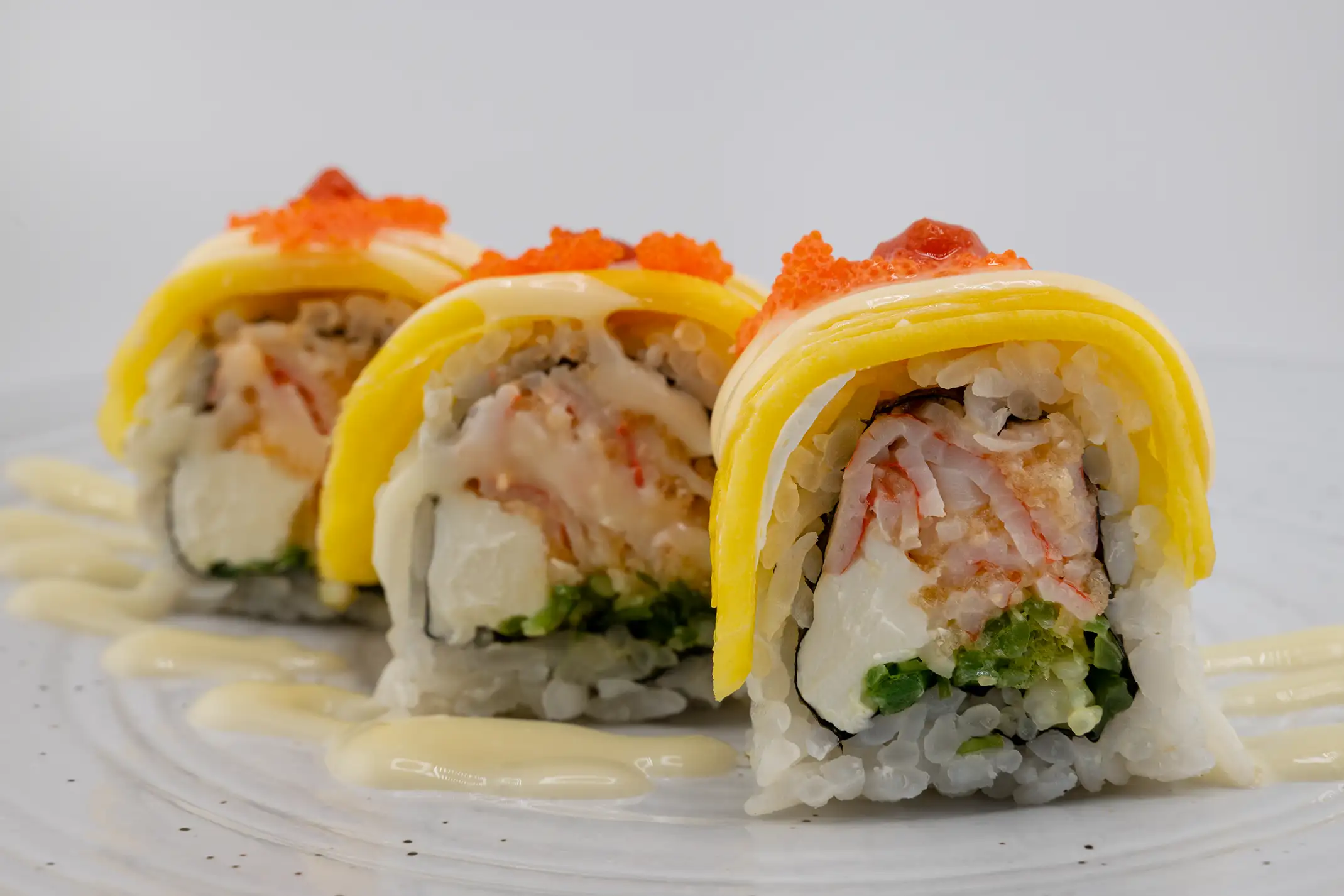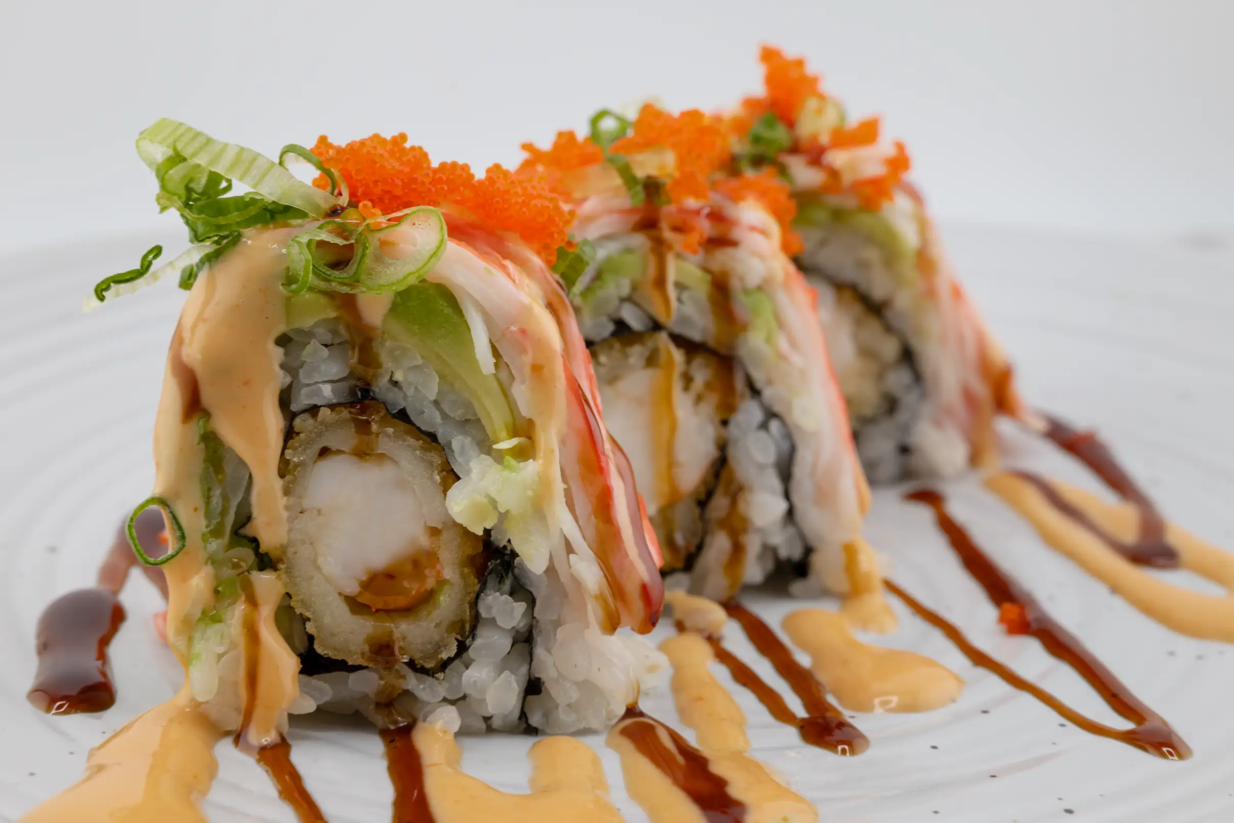 Shrimp tempura inside. Topped with a layer of avocado, kani, spicy mayo sauce, masago, scallions.