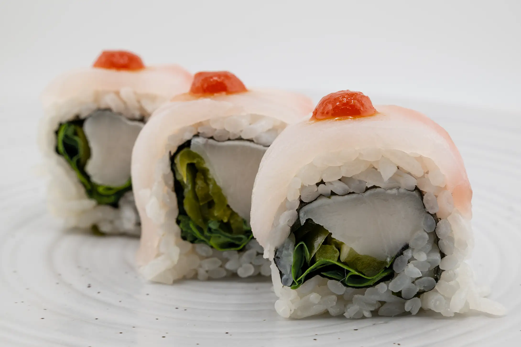 White tuna, spicy tuna, cucumber inside, topped with a layer of yellowtail, jalapeño, and ikura with a side of yuzu sauce.