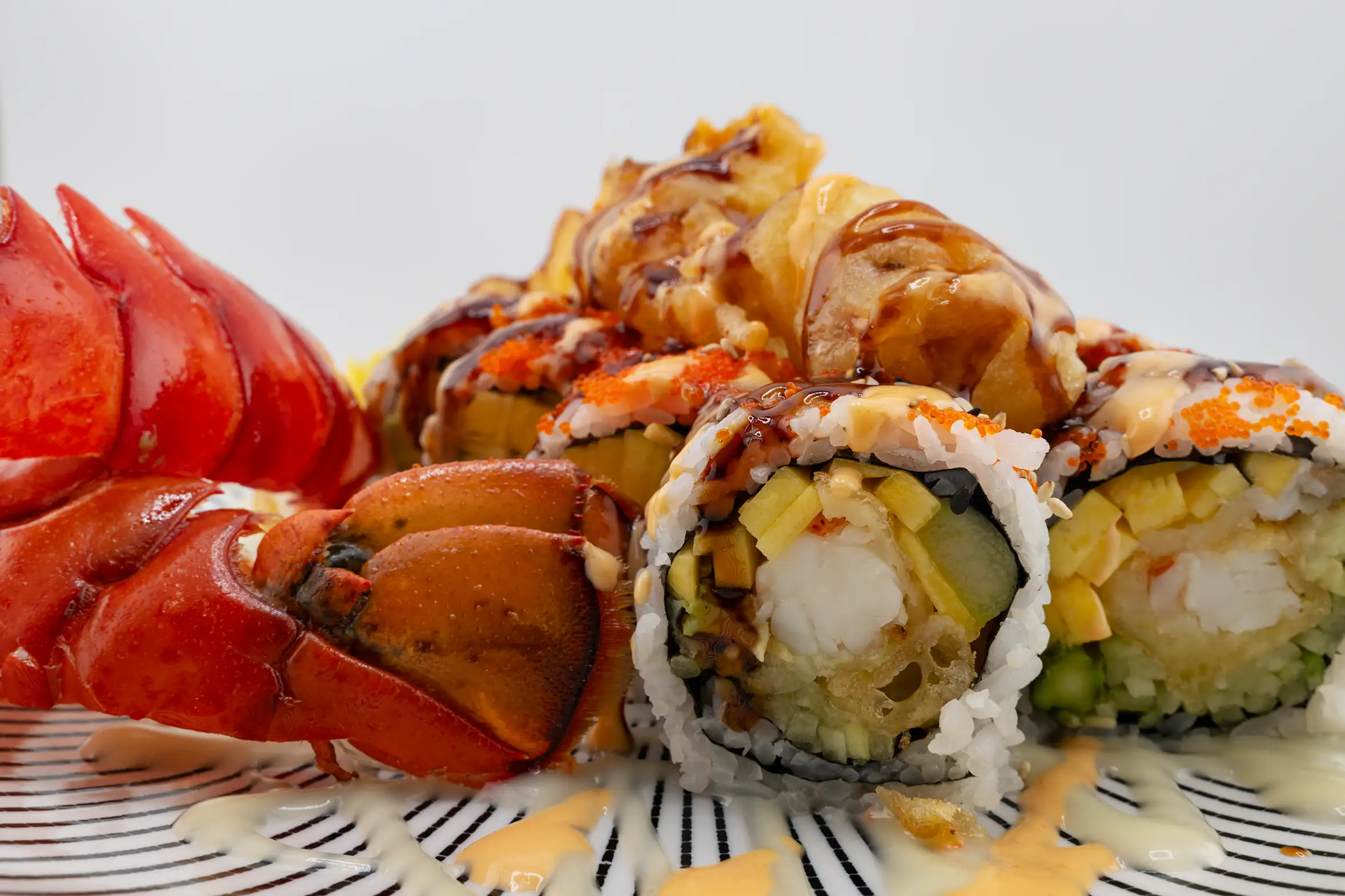 10 pieces. Whole lobster tail tempura fried, asparagus, mango, cucumber, avocado, masago, spicy mayo, sweetened soy sauce and mango sauce.