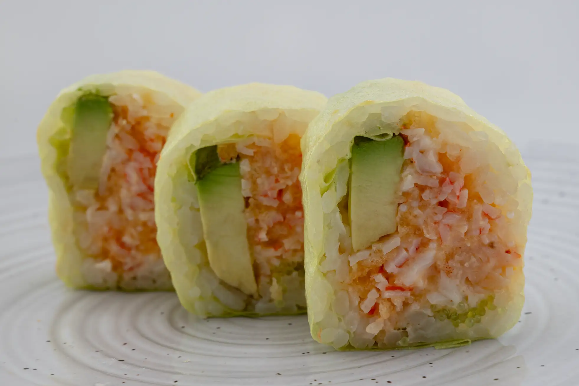 10 pieces. Lobster salad, kani, shrimp, avocado, wasabi tobiko, tempura crunch, wrapped in green soy paper.