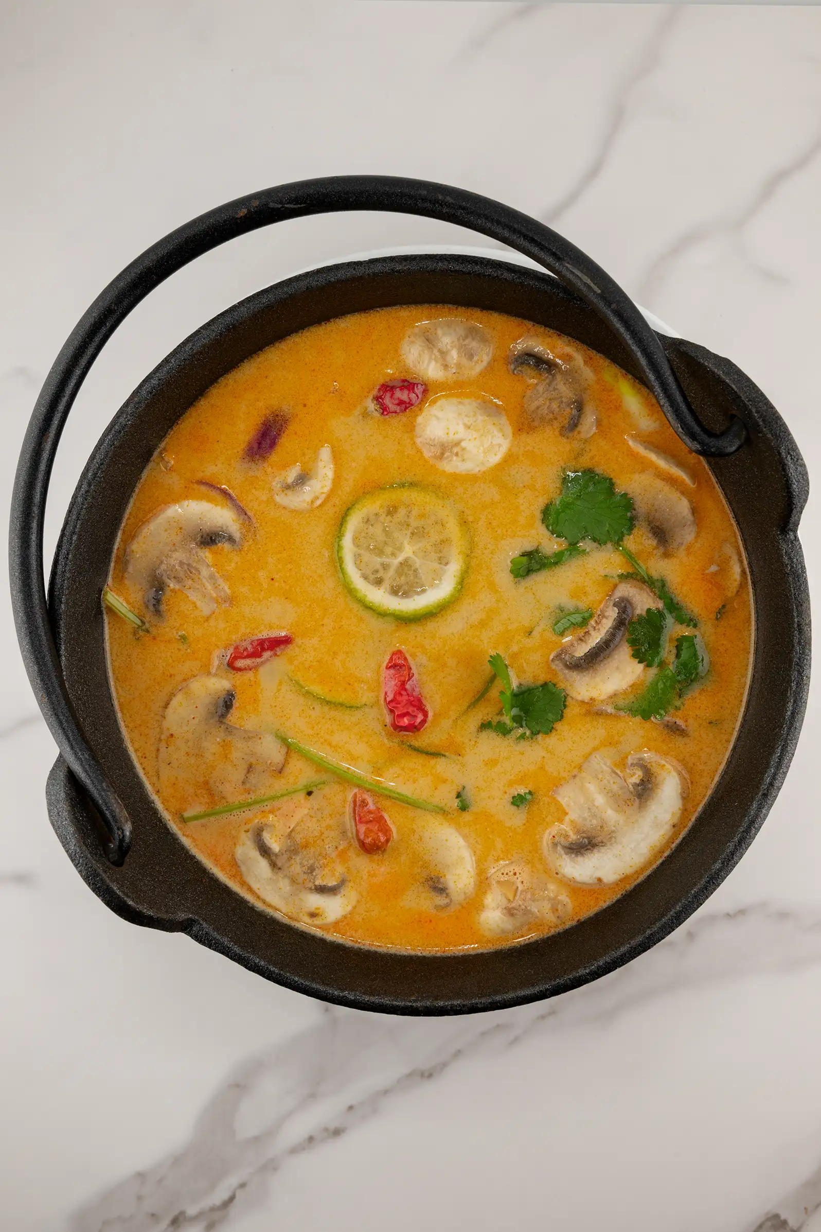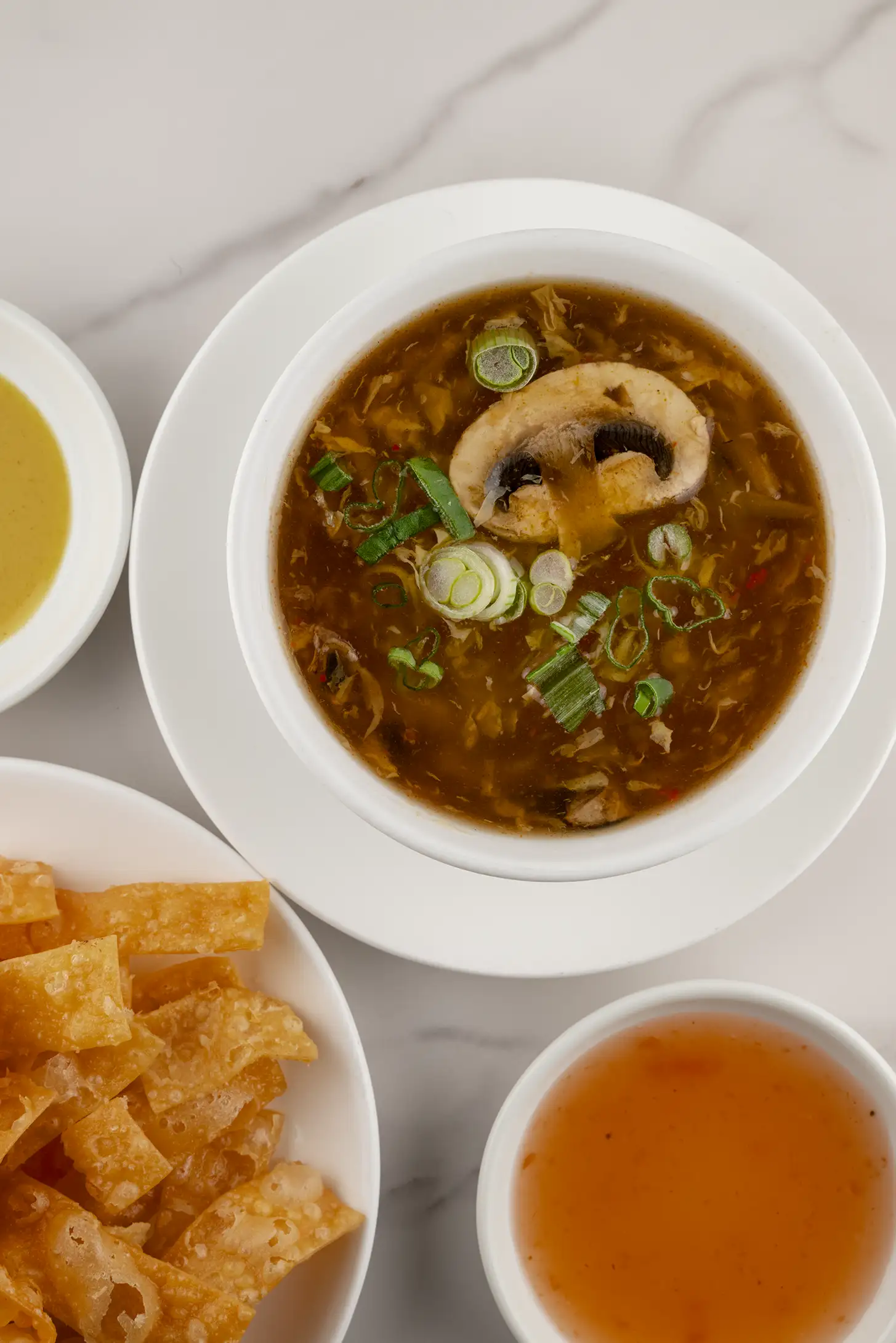 A spicy and tangy soup made with mushrooms, tofu, bamboo shoots, and eggs.