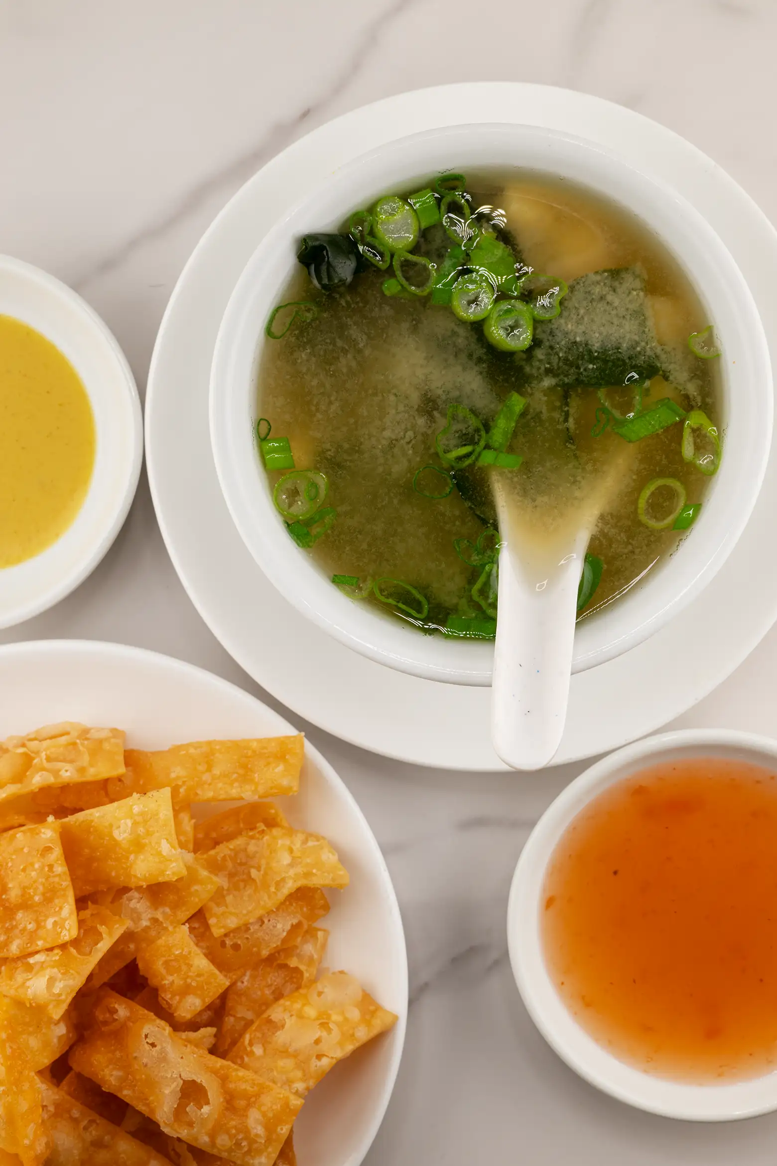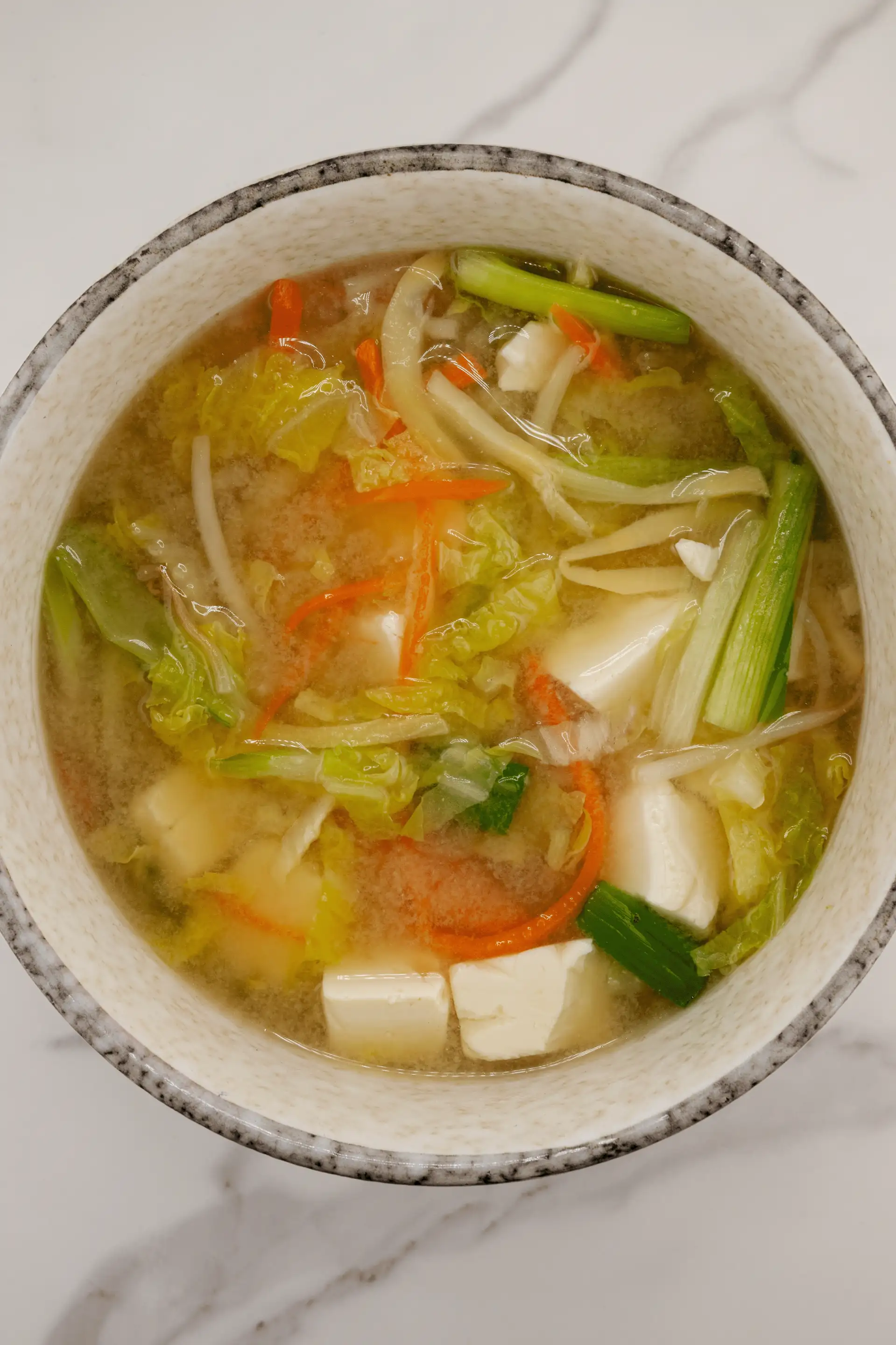Traditional Japanese soup made with miso paste, tofu, and seaweed.