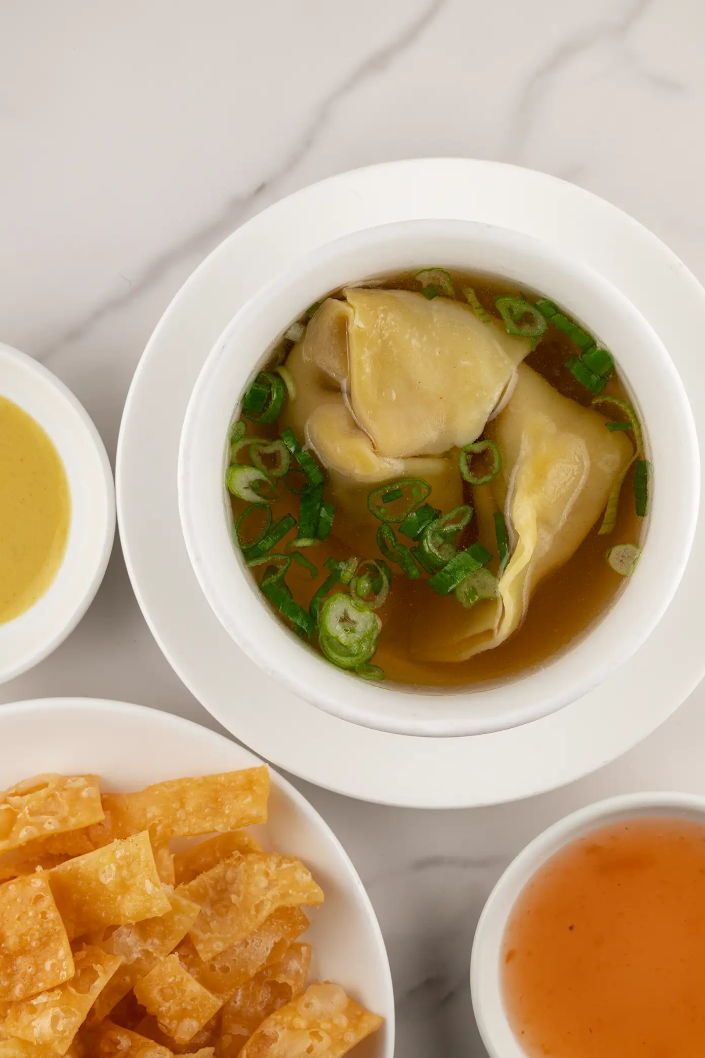 Delicate dumplings filled with seasoned pork and shrimp, served in a flavorful broth.