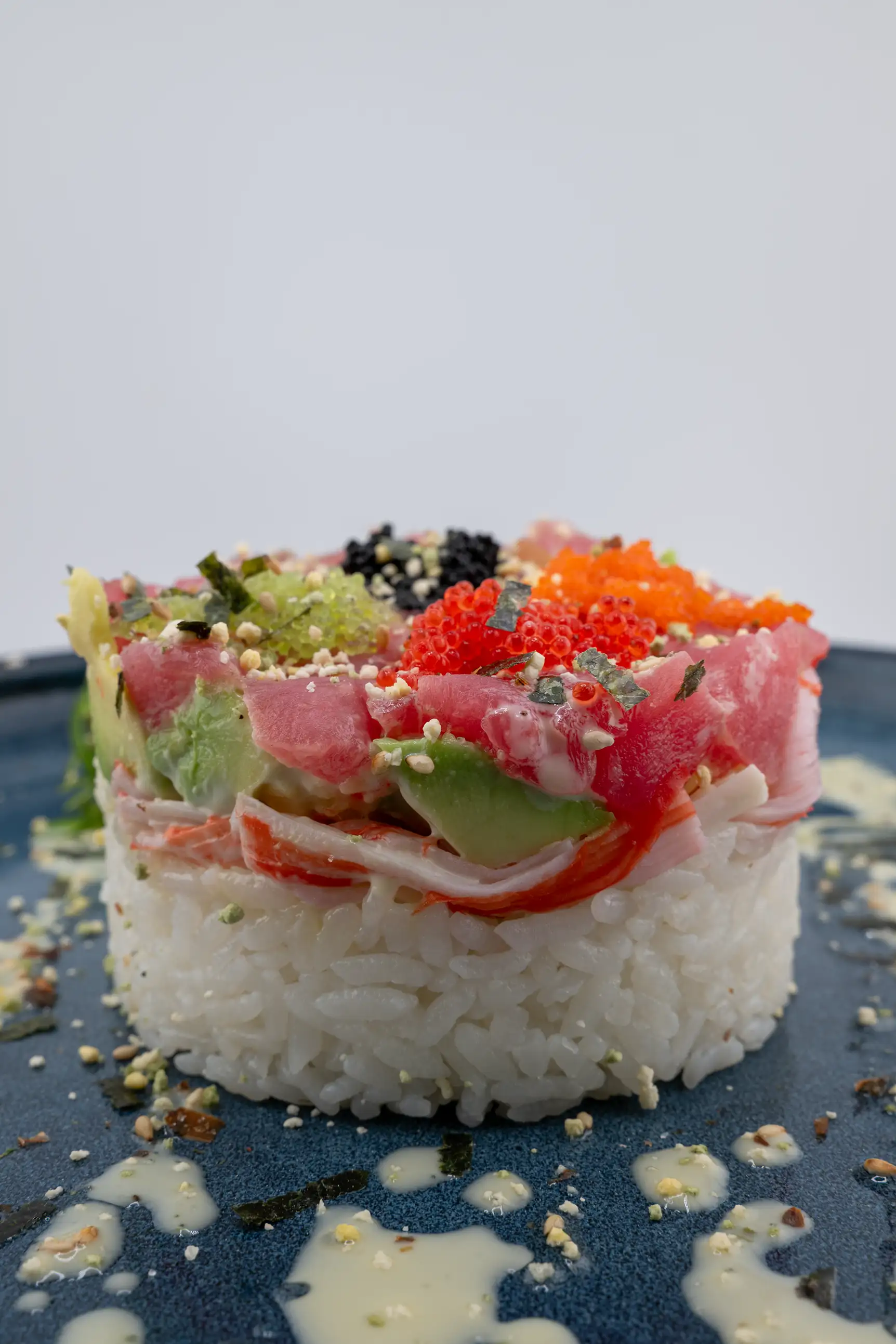 Sushi tower with base layer of sushi rice, avocado, kani and lastly topped with sesame infused ahi tuna. Drizzled with wasabi mayo, dust with sesame seeds and furikake (Japanese seaweed flavoring).