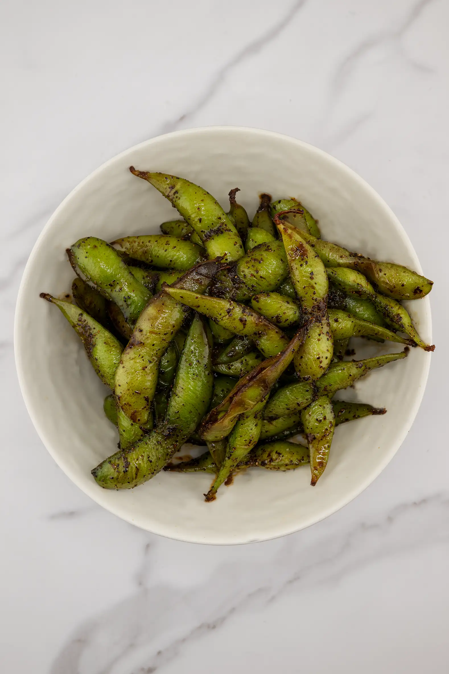 Steamed edamame tossed in a savory black pepper and sesame oil sauce.
