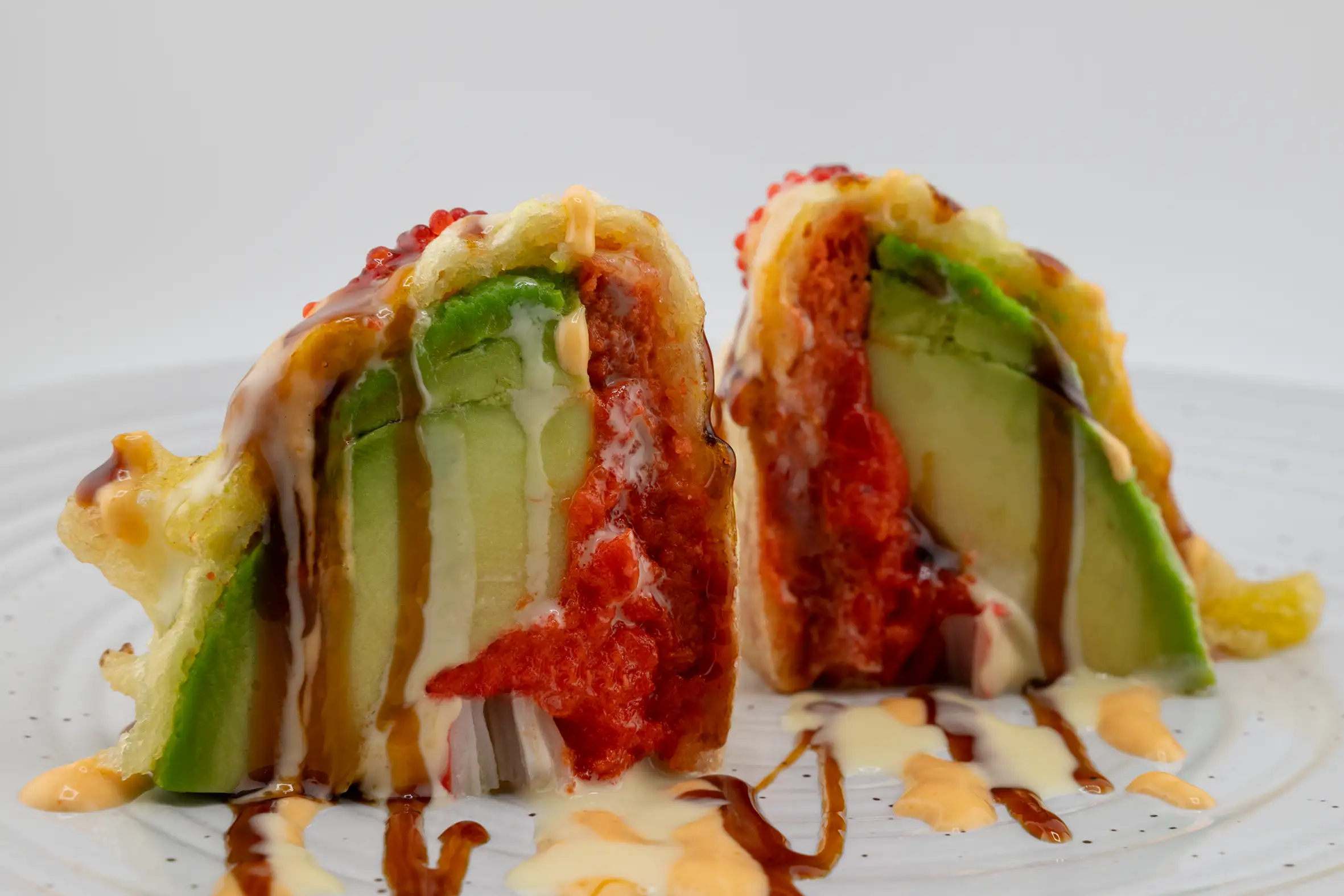 Avocado filled with kani, spicy tuna, crunchy and tempura fried topped with spicy mayo, sweeten soy sauce, and pesto sauce.