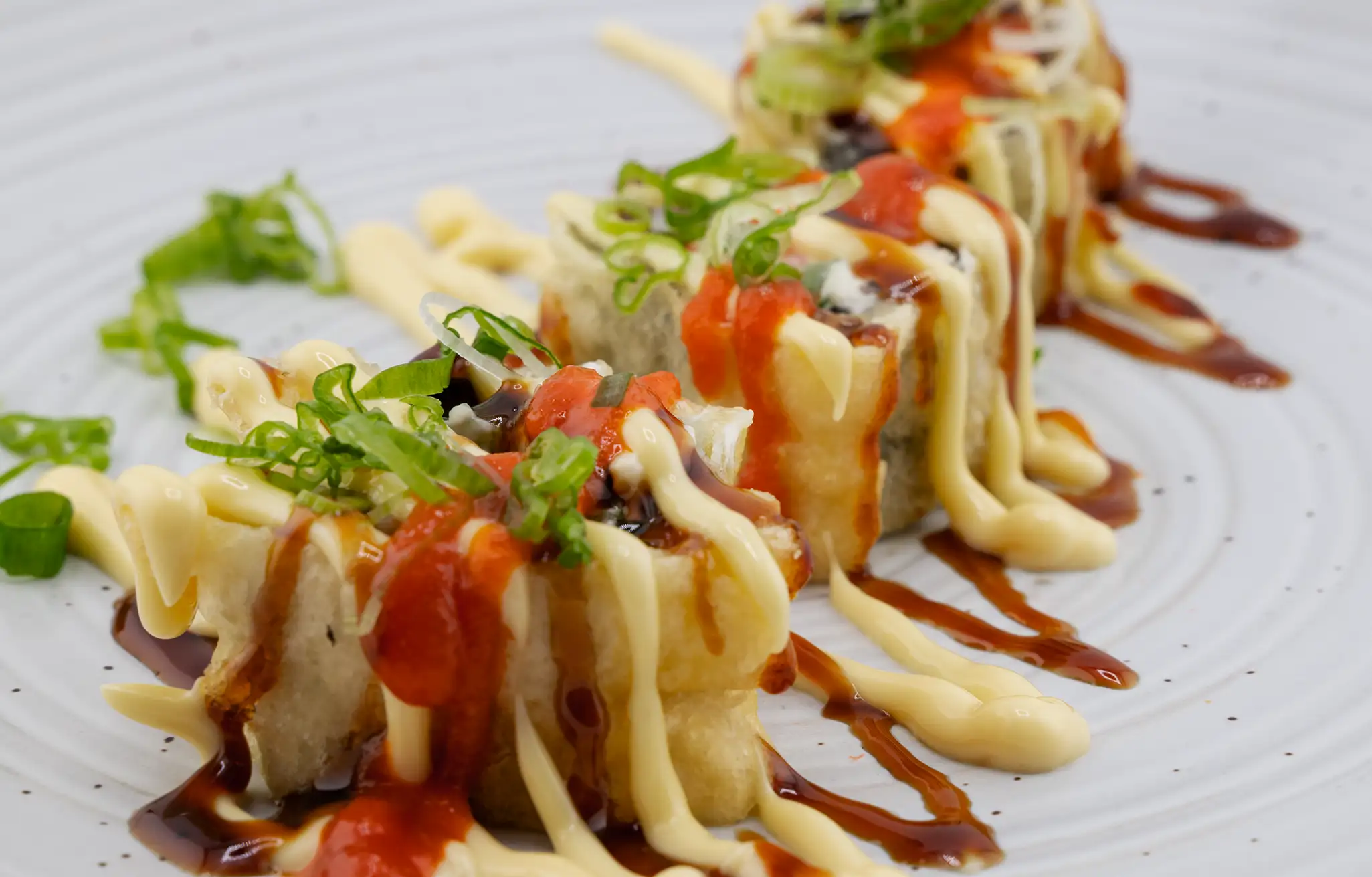 Kani, jalapeño, and cream cheese tempura fried topped with sriracha, scallions, and Japanese mayo.