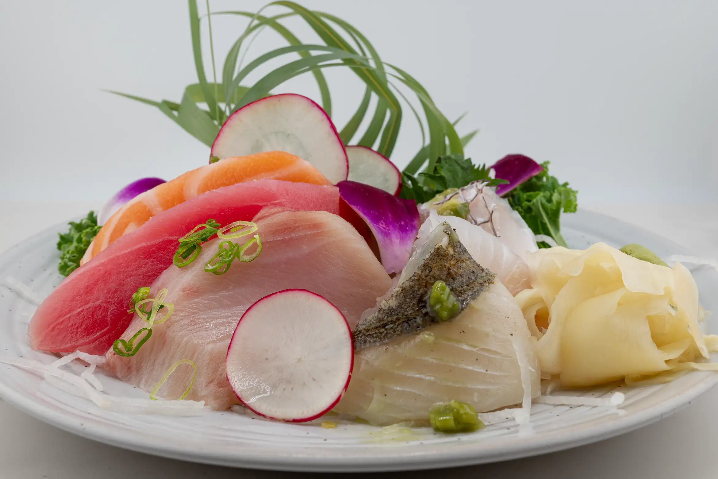 An assortment of fresh sashimi including tuna, salmon, and yellowtail.