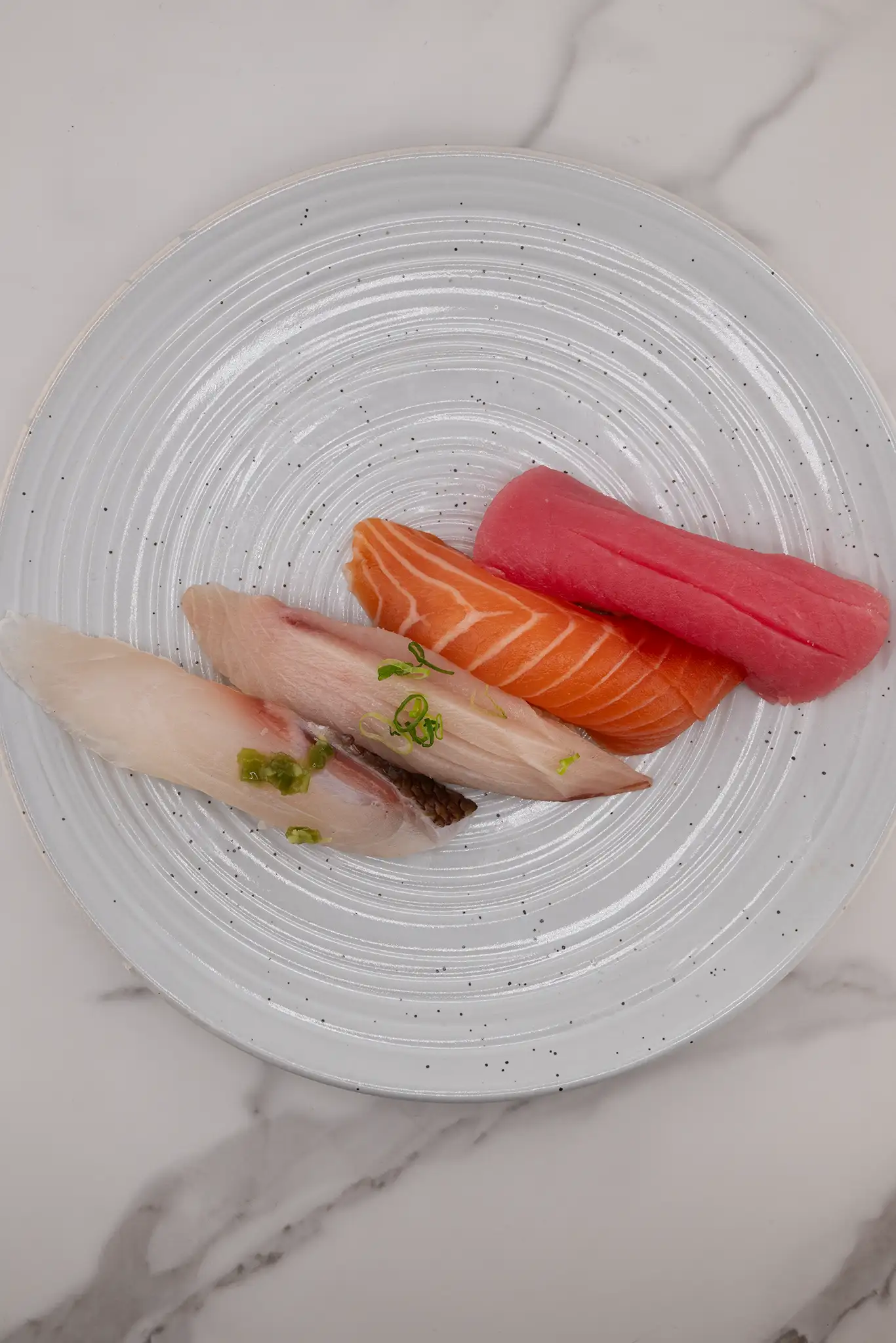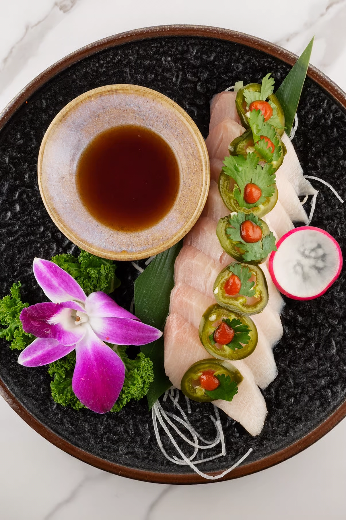 Yellowtail sashimi topped with jalapeno slices and drizzled with a citrusy ponzu sauce.
