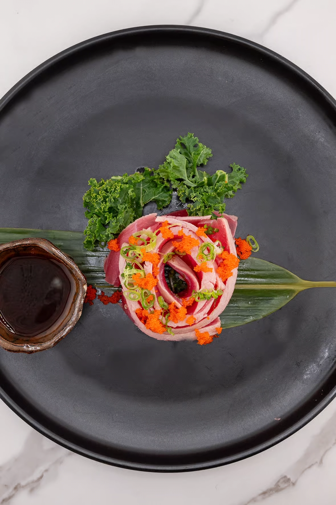 Tuna served with black vinaigrette sauce